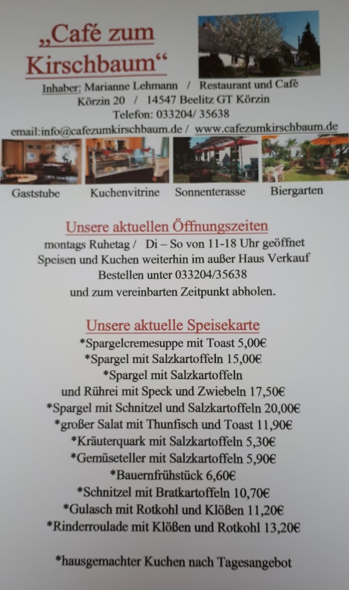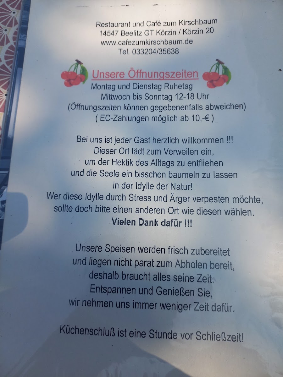 Welcome to Cafe 'Zum Kirschbaum', a charming retreat located in the heart of Beelitz. This delightful café and restaurant serve as a portal to a bygone era, offering a nostalgic ambiance reminiscent of the 1980s. Here, you can enjoy the serenity of the lovely beer garden, surrounded by lush fruit trees, making it a perfect spot for relaxation.